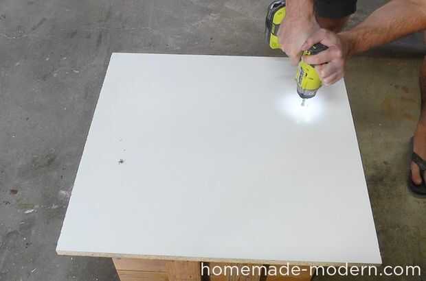 Atornillan algunos retazos sobrantes de melamina a los fondos de los moldes para evitar que el hormigón salga. Madera contrachapada también habría funcionado.