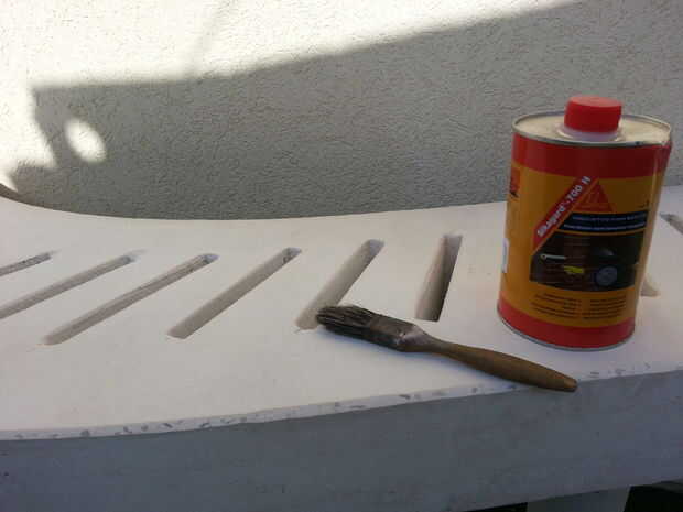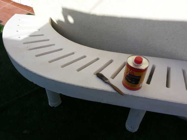 y ahora la parte final de este instructable: impregnación de la banca en 'sellador concreto' sólo tiene que utilizar un cepillo suave para aplicar en toda la superficie.   Este paso garantizará años de color blanco brillante y resistencia a la lluvia y la suciedad
