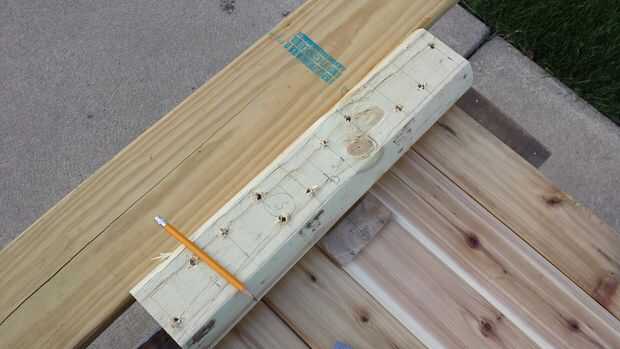 Utilice un trozo de 1 x 6 como una guía de como se muestra en la imagen, por lo que el primer apoyo es cuadrado en la parte superior. Cuando todo parece OK, tornillos de cubierta en cada orificios pretaladrados 3/8" para conectar el soporte con la parte superior. Tenga cuidado de no más de coche el tornillo, como se podría ir por la parte superior! Pongo una marca en mi broca para la profundidad adecuada.