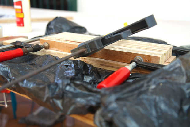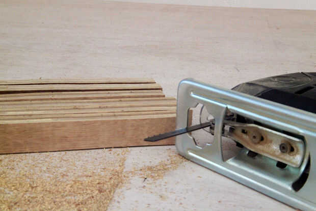 Corte las tiras de la madera contrachapada del tamaño de la plantilla. Luego pega y les afianzado con abrazadera juntos.