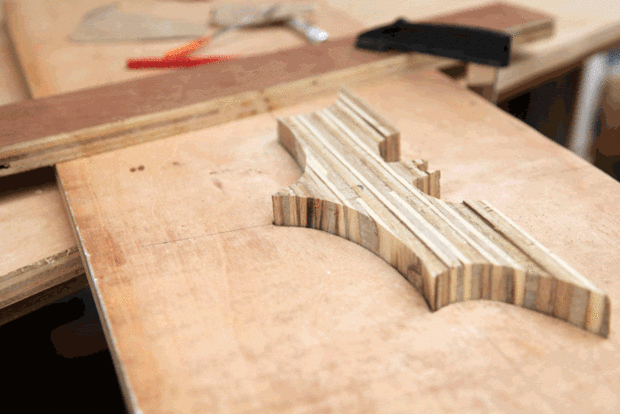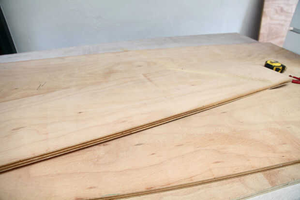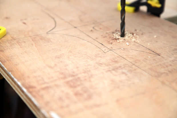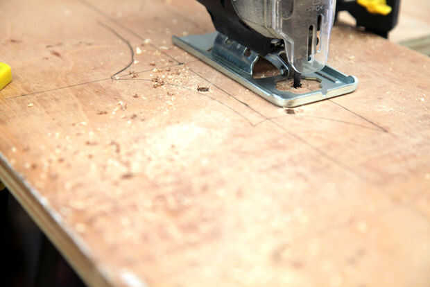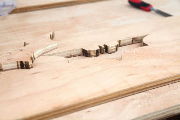 Trazado el corte embutido en una hoja de madera contrachapada, luego recortar con una sierra de calar.