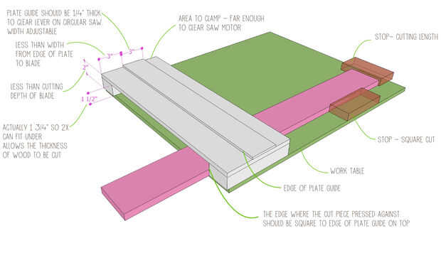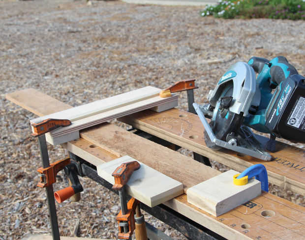 Esta plantilla está hecha para nuestra sierra circular de Makita y cortes de piezas menores de 1.5" de espesor. Es muy sencillo de hacer, pero hay gran cantidad de consideraciones de profundidad de corte de lámina, a espacios en varias partes de la sierra cuando deslice a lo largo de la guía. Tuvimos que recortar y plano a nuestra plantilla un par de veces!