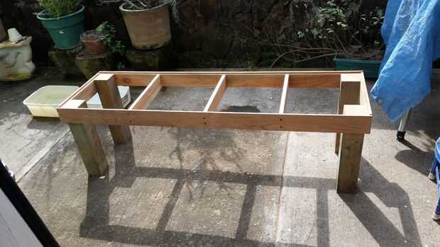 Sujeta el marco con tornillos para madera que tengo. * un poco de nuevo historia, mi padre en la ley de la tienda cuando cerró en 1980 tomó todo lo que no se ha vendido y traído la casa para tener una gran cantidad de tuercas tornillos surtidos etc. para elegir, lo mismo con la leña que está en nuestro garaje * une los soportes del mediados a la estructura de rectángulo y une las patas con tornillos, así.