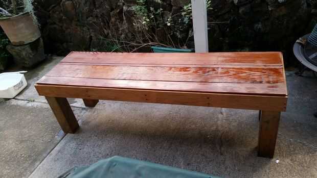 después de lijar, compré algunas manchas minwax... algo bastante oscuro para ocultar el color de patas de madera tratada verde. Porque yo vivo en Hawaii, tenemos mucho sol, así que después de 2 capas de manchas dejaron seco y 'bake' en el sol. se puso muy oscuro! nos encantó!