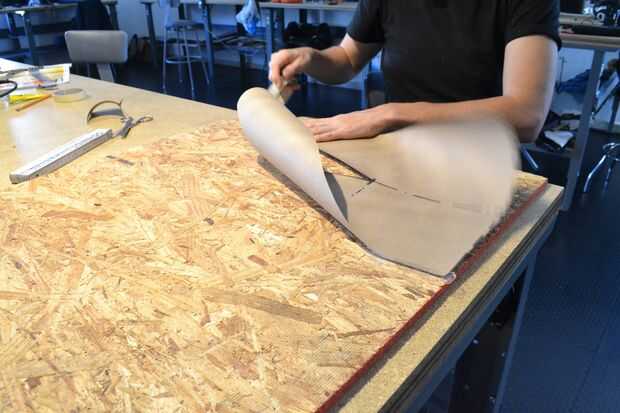 Ponemos la tabla en nuestro lugar de trabajo y sobre ella pegamos temporalmente el boceto (podemos hacerlo con tachuelas). Procederemos trazando el contorno del boceto sobre la tabla. Necesitaremos trazar dos veces.