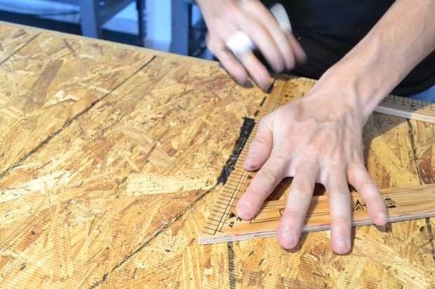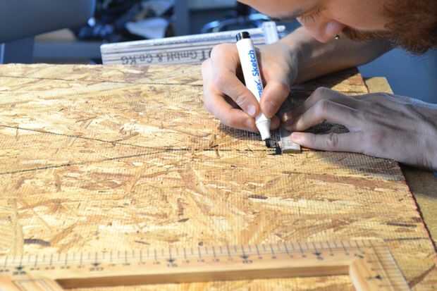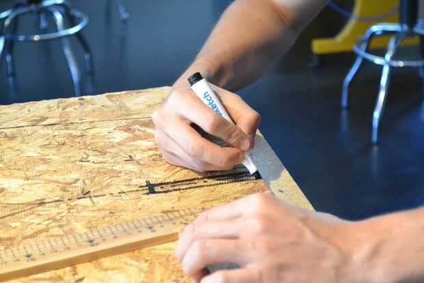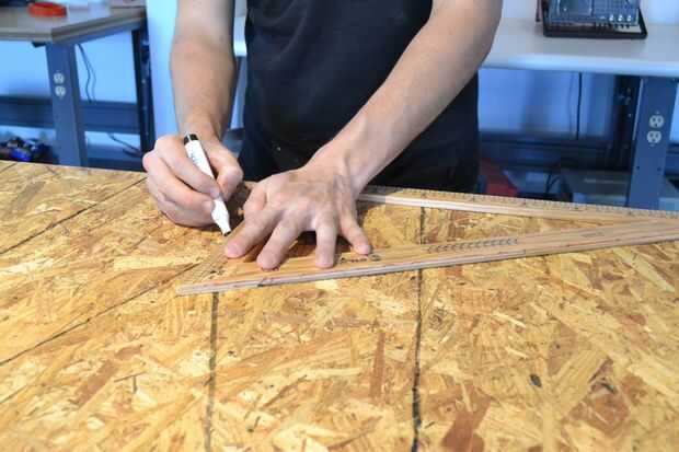 La idea es embonar una cara del banco sobre la otra y para esto dibujaremos una franja de 10 cm de largo por 1,2 cm (depende del ancho de tu tabla). La primer franja la dibujaremos en el centro partiendo de la punta del triángulo hacia arriba, la otra será de nuevo de la costura pero partiendo de la superficie a donde inicia la franja de la otra cara.