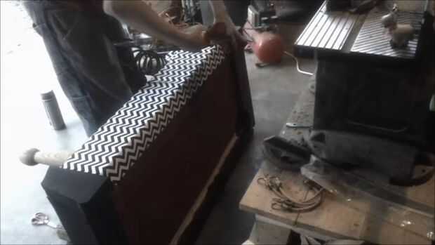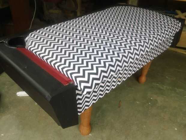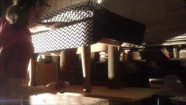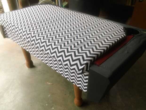 Para el asiento, corté un pedazo de madera contrachapada ligeramente más grande que la parte superior, por lo que sería un poco saliente en la parte delantera. Luego corté hasta algunos viejo lecho con el tamaño de mi madera contrachapada. La ropa de cama por un par de ciclos en la lavadora y salió muy limpio y fresco que huele. Simplemente grapado la tela hacia abajo en un extremo, luego trabajado mi manera alrededor del asiento, asegúrese de tirar tan firmemente como sea posible a medida que fui.