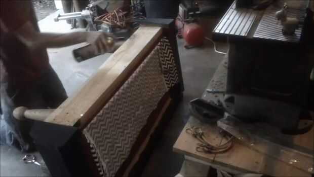 En la pieza frontal, corte una pieza lo suficientemente grande como para tener un poco de proyección en la parte superior e inferior. Grapar la parte superior en su lugar, luego lo volcó. Adhesivo en aerosol ha añadido a la tela y la madera, luego presiona abajo agradable y suave para asegurarse de que no había ninguna arruga. He añadido algunas grapas a la parte inferior sólo para asegurarse de que sostuvo firmemente mientras que el adhesivo.