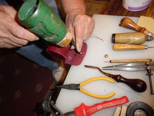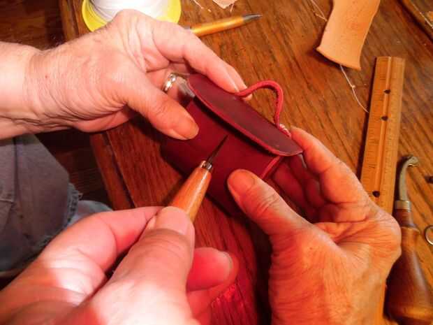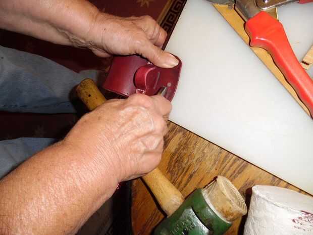 Si elige utilizar el cierre de tipo stud, necesita comprobar donde irá el agujero para que el perno a través de. Después de localizar el lugar, utilice el punzón de #8 para hacer el agujero. Para hacer el cierre apretado y evitar que se corte al hilo hacia fuera, su cuchillo y hendiduras a ambos lados del agujero.