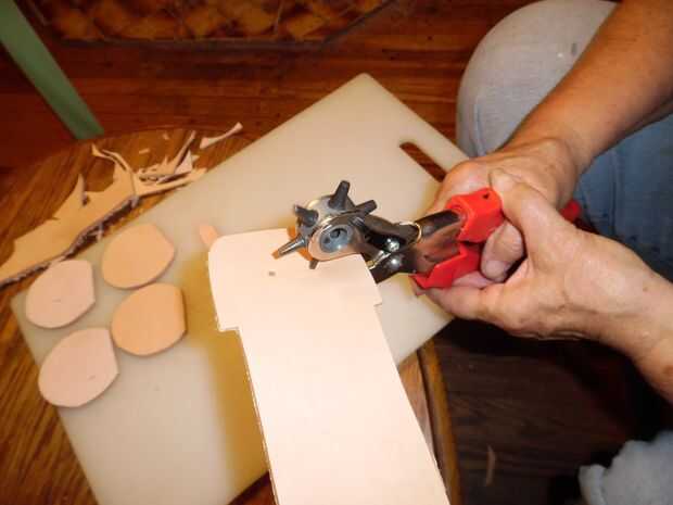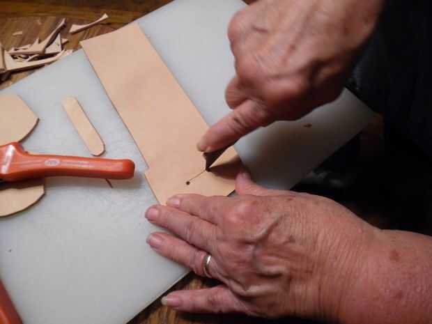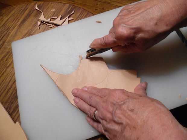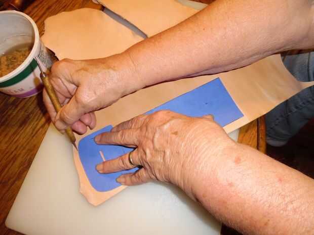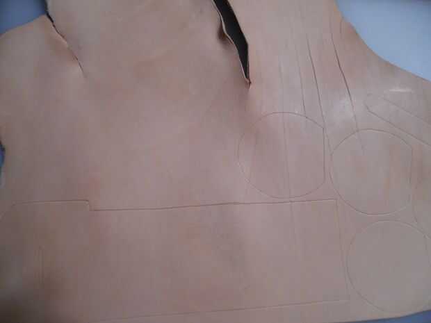 Me ha pasado a tener un pedazo de chatarra cuero lo suficientemente grande para colocar todas las piezas. Si usted está comprando el cuero necesita aproximadamente 1 pie cuadrado de cuero. Humedecer ligeramente la piel. Seguimiento de todas las piezas de patrón en el cuero, utilizando el stylus o lápiz.