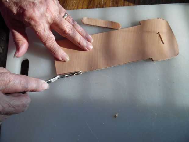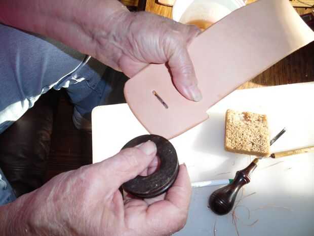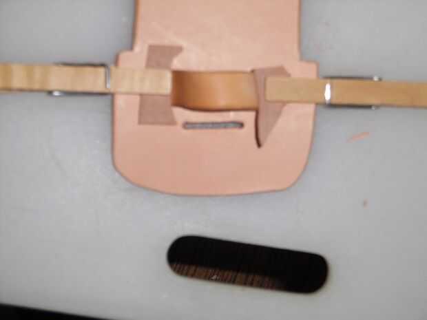 Mientras que los extremos se están secando, tomar la correa y humedézcanlo. Doble los extremos adelgazados de la correa hacia arriba. Centro de la correa en la tapa detrás de la ranura. Con un pedazo de cuero de desecho en la parte superior la pieza del extremo de la manija, fije la correa en su lugar. La abrazadera será cicatriz la piel si la piel no está protegida. Dejar secar completamente. Cuando se humedece el cuero se mantendrá la forma cuando se seca.