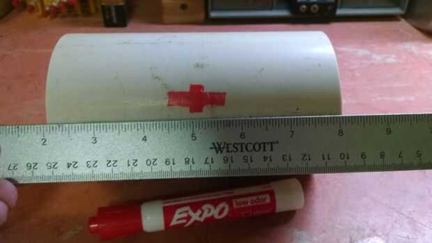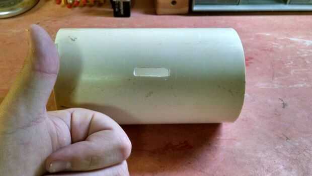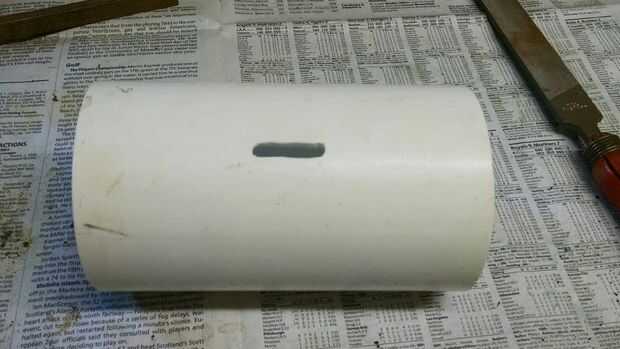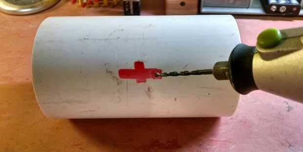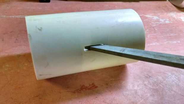 Encontré el centro de la tubería utilizada la herramienta rotatoria con una broca para perforar varios agujeros a continuación utiliza un poco de talla y amolado para alisar hacia fuera. Luego usé la Lima de metal para hacer la Plaza de la ranura.