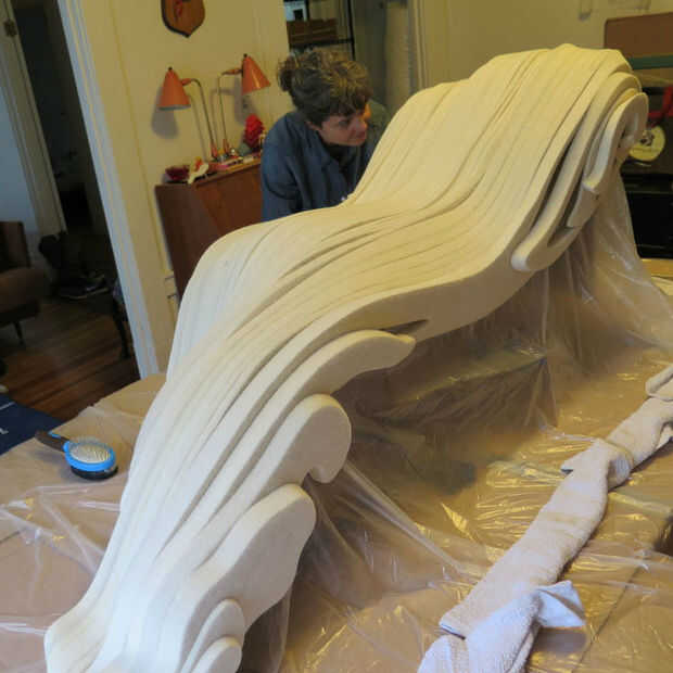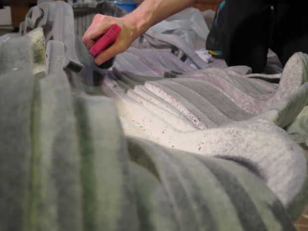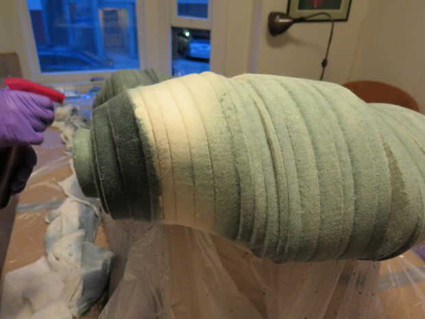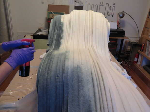 Antes de morir la obra hicimos una serie de pruebas de combinaciones de colores diferentes y diluciones para ver lo que funcionaría mejor con la forma. Puesto que los diferentes espesores de fieltro son también ligeramente diferentes densidades, y la lana es un material natural, habrá alguna variación en la forma que el tinte es tomado de rebanada a rebanada. En lugar de acentuar que además variando el color, hemos utilizado un solo color en toda la pieza y dejar que la luz, sombra y el fieltro sí mismo producen una gama de tonos. Hemos elegido un gris neutral de un tinte líquido negro muy diluido.