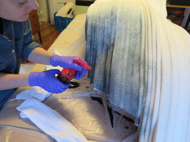 Rocía toda la pieza con agua para humedecer completamente. Luego rocía el tinte, trabajando en secciones a la vez, bien saturando cada área con el colorante diluido antes de pasar a la siguiente.
