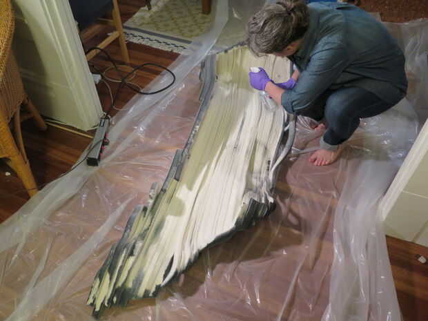 La parte inferior es visible cuando está instalado en la base, por lo que era importante que cubrimos ambos lados. Después habíamos teñido toda la superficie exterior de la pieza, retirar de la base, volcó en una dropcloth e hizo la parte de abajo.
