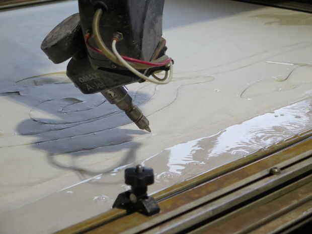 corte de 5 ejes de continuamente cambiar ángulos es algo experimental incluso para la gente de OMAX. A veces funciona tal y como previstos y otras veces la máquina se parece ser controlado por duendes, se congele inesperadamente y puede incluso hacer que usted piensa que han roto una muy costosa pieza de equipo. Estamos trabajando en un Instructable sobre hacer este tipo de cortes y solución de problemas de algunos de los errores que encontró y se enlace a él desde aquí cuando se hace.