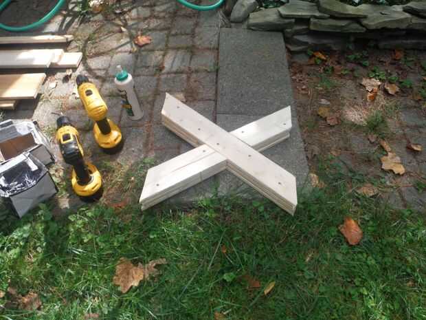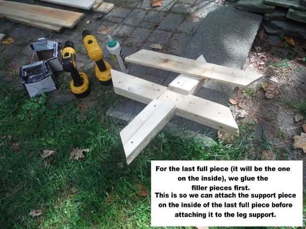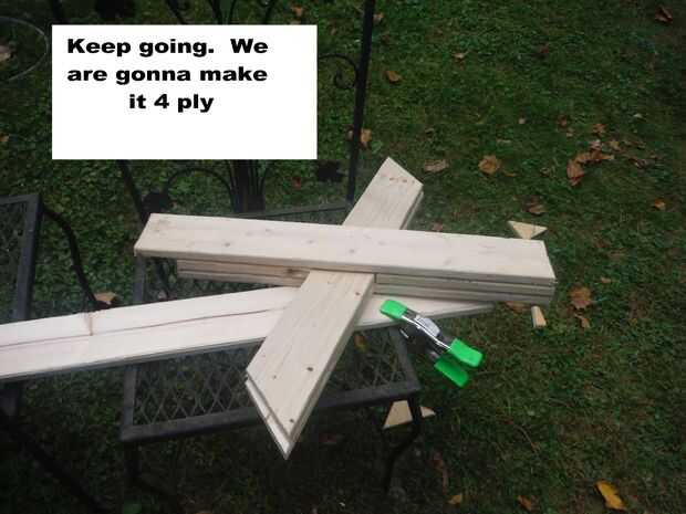 Vas a seguir añadiendo capas de 22 completo "(4 todos juntos alternando hacia adelante y hacia atrás) y piezas de relleno. Añadir la 3 ª capa y cuando añades la capa 4, pegamento las piezas de relleno pero esperar en toda la longitud diagonal hasta que usted coloque la llave primero. entonces los tornillos que sujetan la abrazadera será dentro de la pierna.