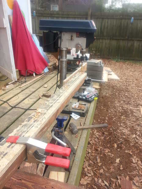 Usando un 3/8" en una prensa del taladro y a partir 2" en el extremo del Banco, perforé cinco agujeros 17" aparte. (Esto es cómo las matemáticas elaboraron). Los agujeros deben ser accesibles desde el frente.