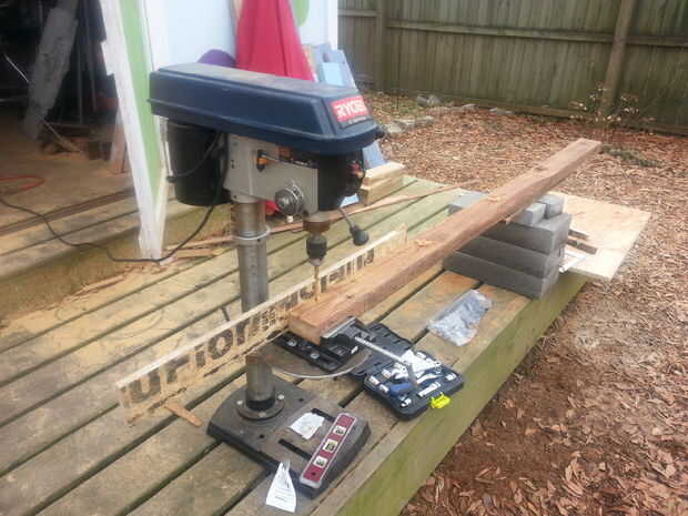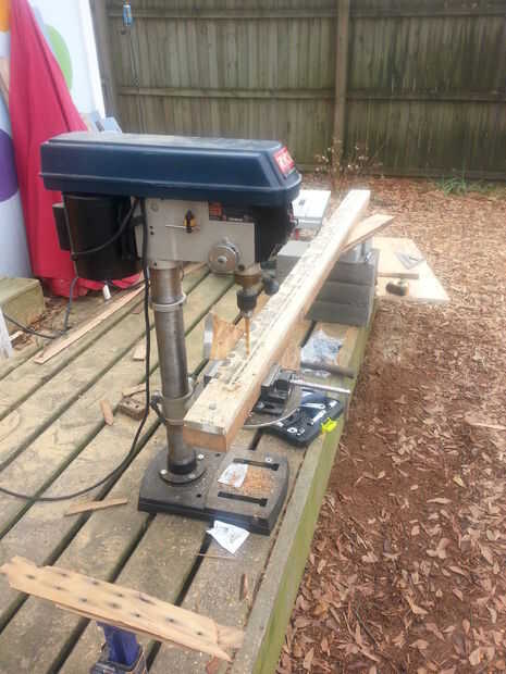 Después de una especie de áspero ir localizando los orificios, hice una plantilla de chatarra OSB de 3/4" y utiliza otra tira de OSB como una cuña al espacio constantemente el trabajo en la prensa de taladro.