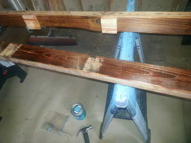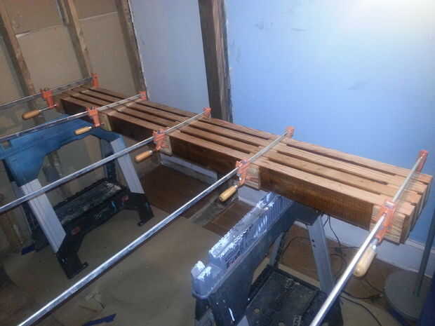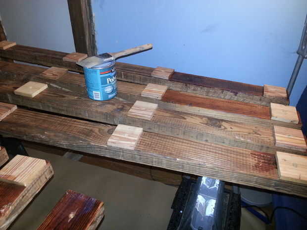 Pensé que simplemente usar las varillas roscadas y tuercas para unir todo, pero estaba convencido de no ser perezoso y utilizar algún pegamento y clavos. He pegado a los espaciadores, alineados los orificios y apareció mi brad clavo de 1 1/2" para mantenerlos en su lugar mientras se seca el encolado. A continuación, pongo unas cuantas capas de clara en lo que sería las superficies interior/oculto, antes de convertirse en inaccesibles.