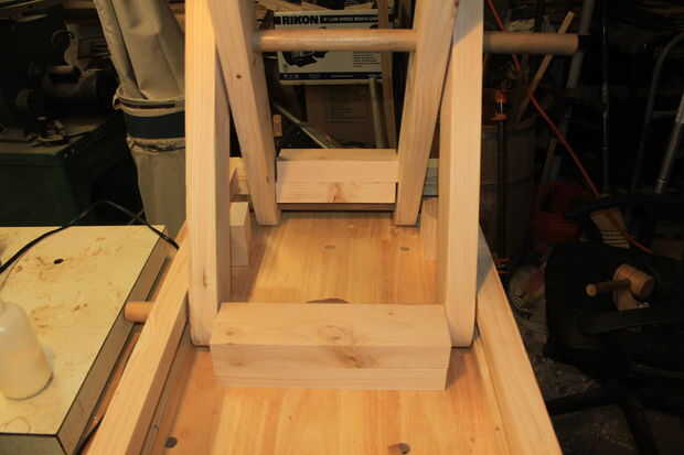 Pegaron y atornillaron algunos soportes para cada conjunto de patas de tijera. Esto es simplemente un 2 X 4 entre cada oposición pata emparejado con abrazadera y atornillados firmemente. Asegúrese de que usted tiene los tacos y ronda los bloques espaciadores en su lugar y alineado antes de sujeción y pegado de la pieza. No quiero errores.