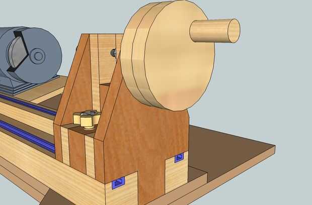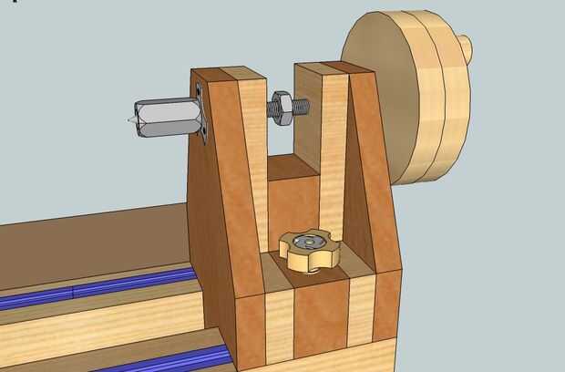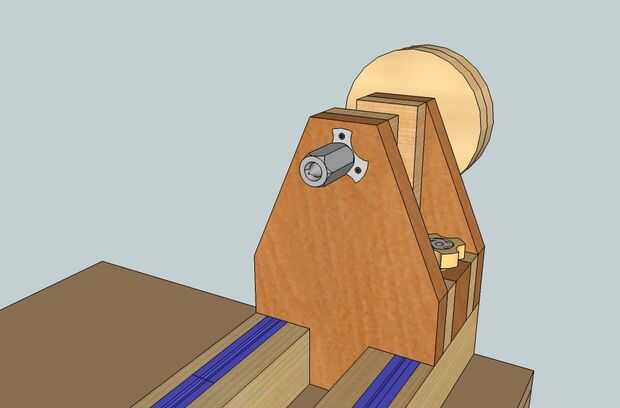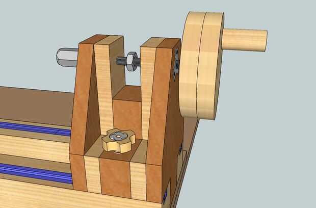 El pedazo de madera del centro del cabezal móvil, es un pedazo de madera o dos 3/4 madera contrachapada pegadas y cortadas en forma de Cruz. La altura no es importante como dejar espacio para la tuerca de la varilla a apretarse con una llave. La madera del centro también proporciona suficiente para las dos perillas para sujetar el contrapunto de la mudanza de sujeción.