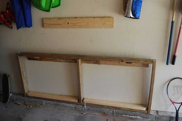 Utilizando lo tornillos montaje en plataforma el marco Swingframe y Banco de trabajo a la pared. Usé 2 tornillos en cada semental cubrió. (Esto ayuda a tener un amigo o dos sostienen en su lugar en este punto, porque no han hecho las piernas todavía)