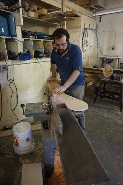 El abeto que estaba usando para las piernas era áspero cortada y doblada, así que molido para arriba en la Machimbradora y cepilladora darme cuatro patas 5 X 5 cuadradas. Corté las piernas a 30" de largo por lo que tendría un banco 34" alto al final.