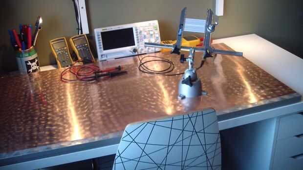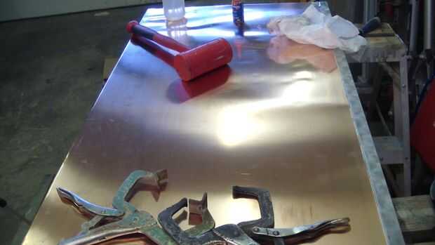 Use un martillo de cara suave y borde recto para formar la banda de cobre alrededor de los bordes de la madera contrachapada.