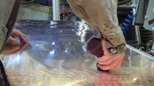 Aplique el acabado que desee. Usé un patrón bruñido circular para romper el look ondulado de cobre. Si tomar mayor cuidado y usar más pegamento, podrá conseguir una tapa de cobre plana del espejo.