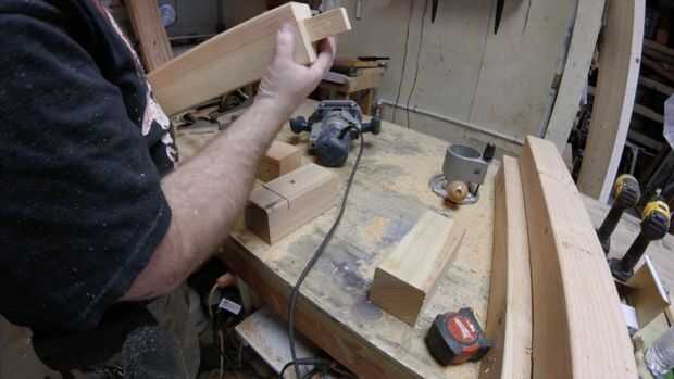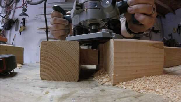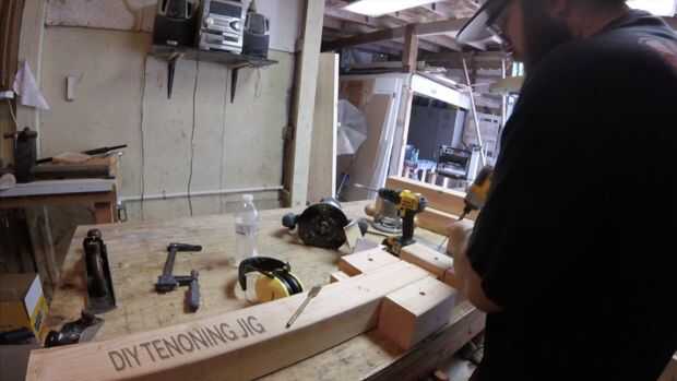 El espigado "jig" que utiliza es bastante primitivo. Enrosca tres recortes del mismo post de 4 x 4 a la mesa para rodear y abrazadera sin apretar el post a la mesa. A continuación, solía un 3/4" recto poco en mi router por penetración del cerdo hacia fuera el material todo el camino alrededor del poste. Fue muy divertido!