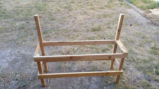 Lados fueron construidos primero marcando la longitud de las patas cortas sobre las largas piernas. Perforar agujeros en las placas de 13 pulgadas y conecte las piernas en ángulo recto con 2 tornillos en cada extremo.