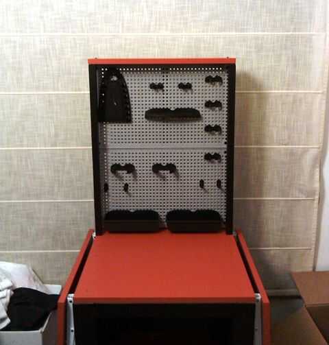 Aunque el plan inicial era ir con el material real (madera), terminó siendo mucho más barato usar unas hojas de pegboard plástico premoldeados (completa con soportes y ganchos surtidos).