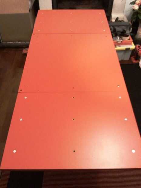 1 - marque los orificios con la tabla boca abajo, con las extensiones de la mesa en el lugar en el piso (esta forma tuve que poner los brackets al revés en las extensiones de la mesa y marca-ver última imagen de SketchUp);