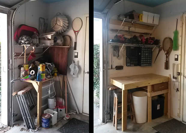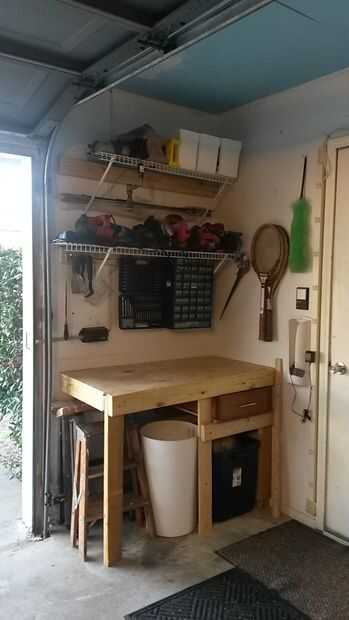 , Mi banco de trabajo era un lío caliente. Originalmente lo había construido de muy pocos materiales de desecho. Es inestable y siempre cubierto de herramientas, ya que no tengo un lugar adecuado para almacenarlos. Este verano, construí estantes en el resto de mi garaje. Ahora era tiempo para arreglar la mesa de trabajo.