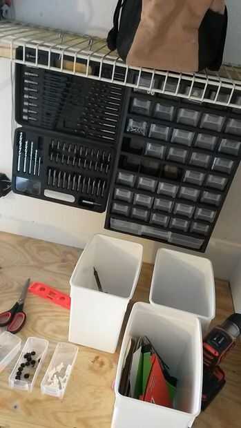 Todas tus herramientas y piezas en contenedores o cajas y en los estantes.