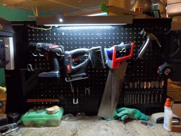 Haz primero un pegboard. (Mi pegboard tenía un marco del metal que nos atornillan a la Junta de la cubierta del Meno) A continuación si su pegboard no tiene una estructura de metal que sea madera. Hacer un marco de madera uniendo 1 por 2 o 2 por 4 en la parte posterior del pegboard. Haga un rectángulo hecho de 1 por 2 al igual que la versión de metal que hice en las imágenes: 1, 2 y 3. siguiente tornillo en su lugar atornillándolo a la Junta de la cubierta/de la cañería. Luego coloque las clavijas en el pegboard