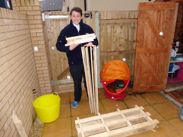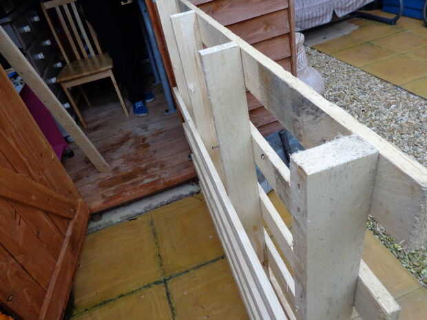 Ahora necesita desmontar la mitad de la paleta que no se está utilizando para que pueda utilizar las tablillas como el escritorio, después de que usted deba quitar los listones en la otra mitad para que encajen todos los listones junto sin espacios. Dejar algunos en la parte inferior porque usted puede añadir cajones que se pueden hacer fuera de los cortes des.