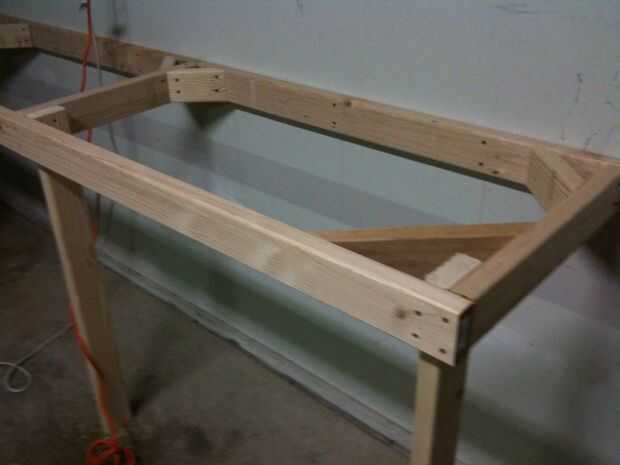 Una vez que se hayan completado las piezas cuadradas del marco, es el momento de: triangular, triangular, triangular! He instalado un montón de 2x4s a inglete para añadir estabilidad y distribuir el peso entre las diferentes partes del Banco. Había variado la longitud de estos de modo que los tornillos clavados en los pies no entraría en contacto dentro del marco. Puedo decirle que el Banco apoya todos 215 libras de mi peso en cada punto, por lo que debe hacer bien para usos normales.