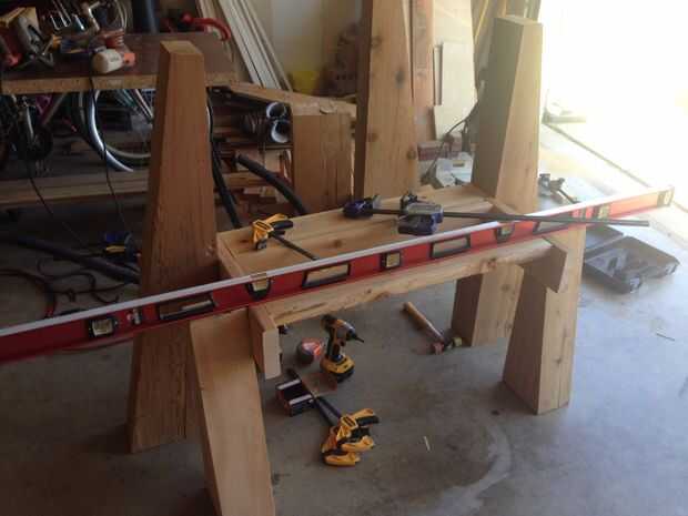 El soporte principal consta de dos corredores de 20" 2 x 6 con tres 33" largo 2 x 6 travesaños. Puse dos de la Cruz plana de miembros para ayudar a anclar la parte superior de la lengüeta y el surco.