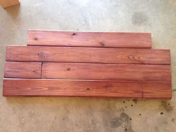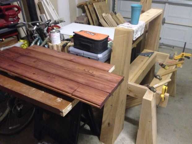 Una vez que todas las piezas se encajan, lija la parte superior montada con 60 arena y papel de lija 150 arena. Después limpié todo el polvo apagado, apliqué dos capas de tinte de lustre semi.