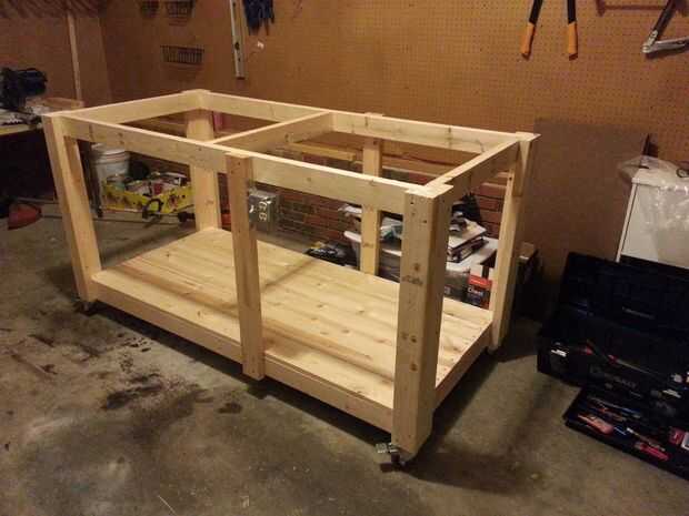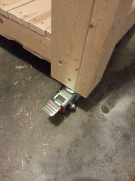 Con cinco tablas de 1 "x 6" a 6' longitud hacer el estante inferior. Esta fue mi principal razón para hacer el marco de esta manera, para que estas cinco tablas se encajan fácilmente en la parte inferior. Con el Banco empieza a parecerse a un banco, pensé que ahora era un buen momento para añadir algunas de las utilidades. Las ruedas son 3" ruedas que giran 360 grados y pueden bloquear. Cuatro tornillos y arandelas de mantienen las ruedas en las patas y la misma esquina del bastidor. Tuve que ser cuidadoso cuando se agregan las ruedas como no quería que uno de los tornillos de la rueda a un tornillo de la parte inferior del marco o las piernas.