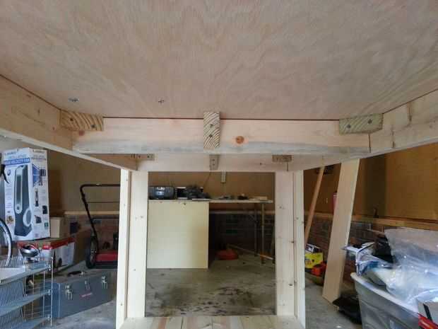 Lamentablemente sólo tomó una foto cuando hice la tapa de tabla. Corté el 4 'x 8' pedazo de madera contrachapada de roble en 3'x 6' en la parte superior y quedar al ras de la esquina y las piernas medianas. Debajo, usé izquierda sobre pedazos de triángulo de 2 "x 4" para ayudar a sostener el Banco hacia abajo. La parte superior se lleva a cabo en todas las esquinas en el marco (8 puntos) y en el centro de los puntos abiertos (8 puntos, sobre todo entre las esquinas de la parte larga del marco). Usé 1" contador de tornillos hundido para evitar puncionar a través de la mesa.