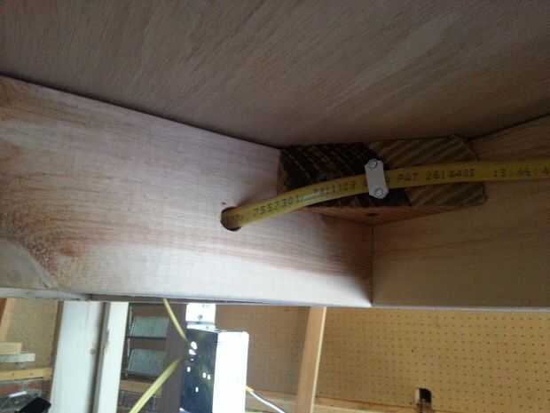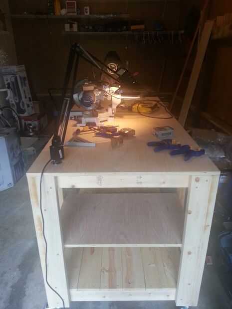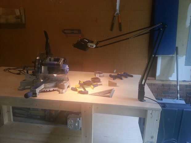 También perforé un agujero en la tapa de tabla de la lámpara. Encontré la lámpara en una tienda de hospicio por $7, y como extra tiene una toma de corriente en su base. No sólo esto da un buen poco de luz para trabajar, me da una salida en la parte superior del Banco, así.