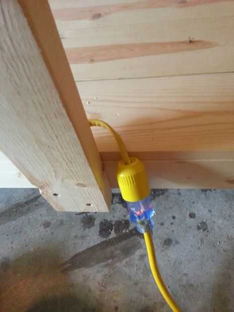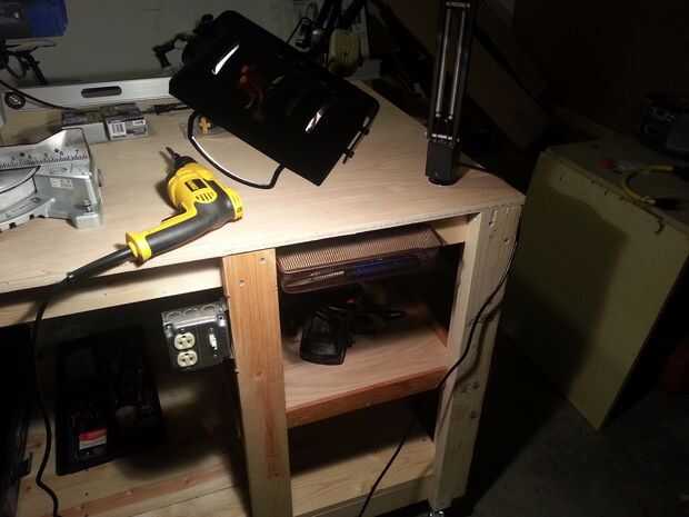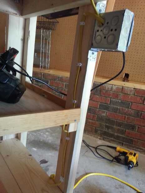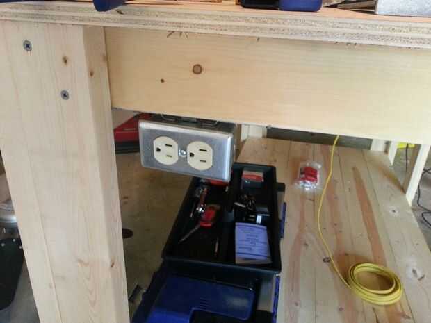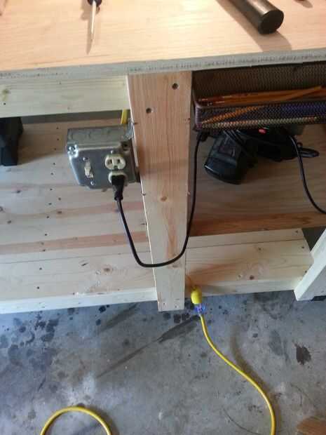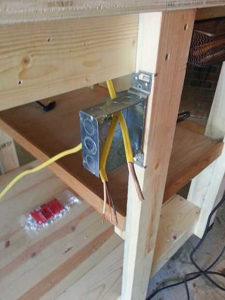 Tener accesible poder fue uno de mis objetivos principales, por lo alambré hasta dos tomas de corriente y el interruptor de la matanza. Potencia va desde un cable de gota a la banca, hasta el interruptor. Del interruptor va a la salida al lado del interruptor y a la otra toma en la esquina lejana. La conexión donde se conecta el cable de gota no es el mejor, y no estoy muy contento con él. Esto es algo que planeo actualizar/modificar para ser más seguro.