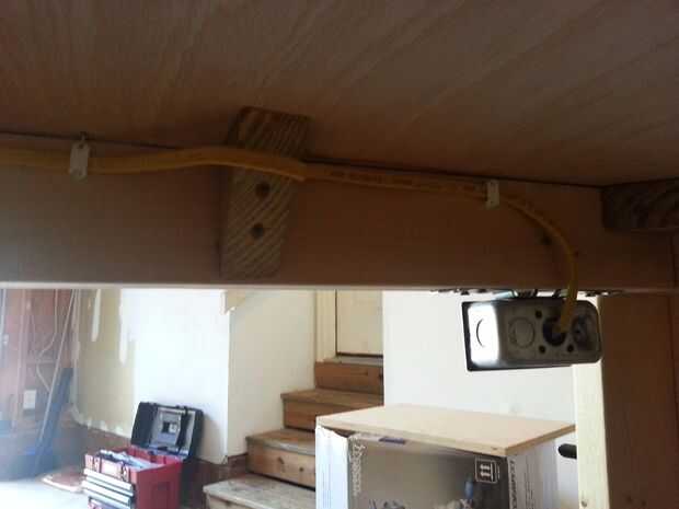 Usé alambre 14ga presionada con las grapas correspondientes. Cuando llegué a un soporte, opté para perforar un agujero a través para mejor ocultar el cableado. La matanza cambiar obras interrumpiendo el cable "vivo" o "caliente" (uno negro) antes de ir a cualquiera de los puntos de venta. De esta forma, si algo pasa hay hilos (es decir, sierras!) Puedo cortar la energía a todo en el Banco.