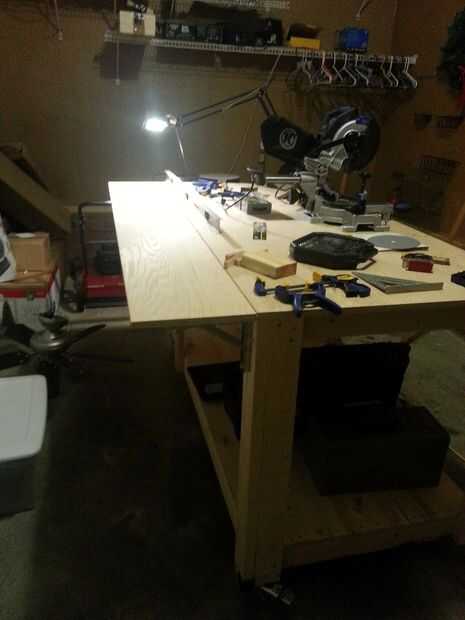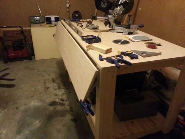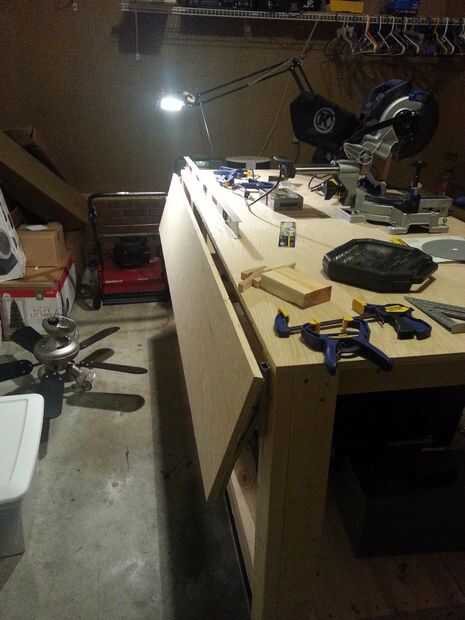 En este punto había pedido a mi papá su opinión sobre varias opciones de diseño. Tuvo la brillante idea de usar el 1 'x 6' pedazo de madera contrachapada izquierda encima de la mesa como una mesa extensible superior. Ya que no tengo otro uso para él, esto fue un gran uso para él. Después de un poco de búsqueda, encontré los soportes marinos que podrían apoyar a 200 libras cada uno y bloqueado en su lugar. Estos son los soportes tiene, pero tomó un poco de tiempo para encontrar un buen precio y coste de envío decente. Estos soportes son difíciles de instalar, ya que tiene que ser muy precisos cuando se atornille en. Después de conseguir la madera unida, tuve que aflojar los tornillos de los soportes y vuelva a alinearlas. Con los soportes torcidos, la Junta no doble hacia abajo todo el camino. Después de enderezarse les, la Junta plegar mucho más, haciendo posible que casi el Banco al ras contra la pared.