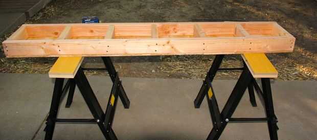 1. construir el marco. Esto se hace lo mismo que los otros marcos con una excepción. En lugar de los tableros cortos exteriores va en el exterior de largo 2 x 4 van en el interior. Tomar un buen vistazo a la foto para ver lo que me refiero. Los espacios entre cada viga es 10". Recuerde dejar 1 1/2" espacio de la viga al medir. Si esto no es perfecto no es gran cosa. Sólo trate de les espacio como incluso como sea posible. Utilice los tornillos de 3" para ellos.