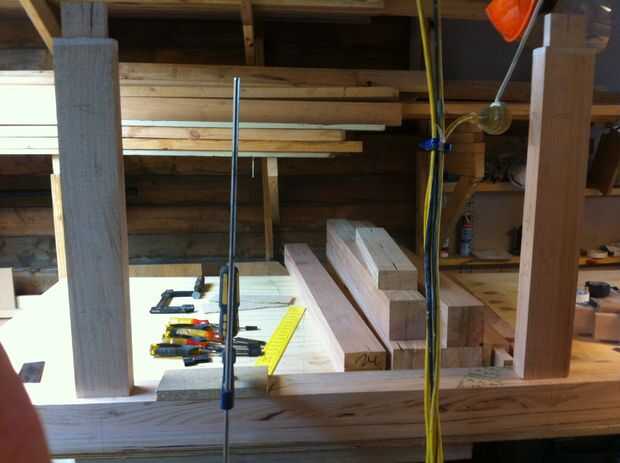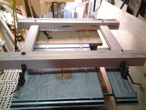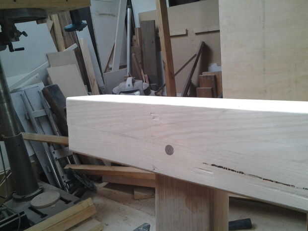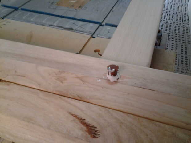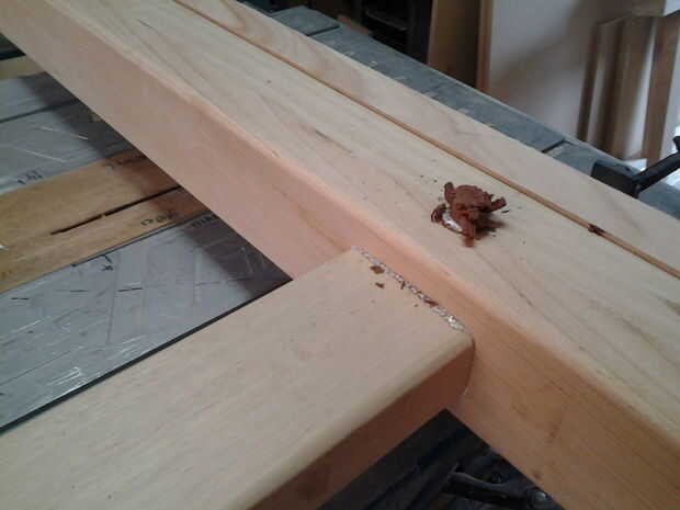 CUADRADOS Y AFIANZADOS CON ABRAZADERA JUNTOS CONDUCIR SUS ESPIGAS A TRAVÉS PERO NO COMPLETAMENTE. DEJE SUFICIENTE PARA CORTAR Y LIJAR.