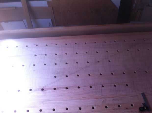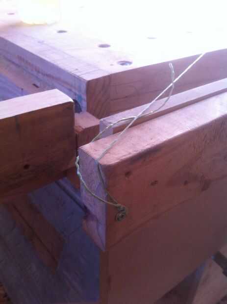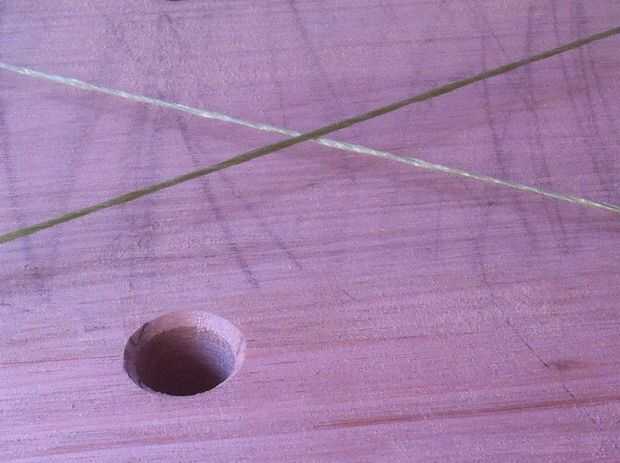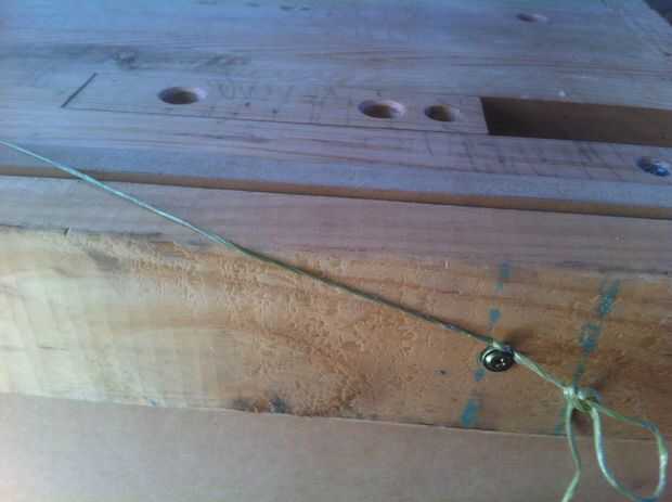 lugar un tornillo varias pulgadas debajo de la parte superior del borde recto y como a cada esquina como usted puede. Conecte cable o cadena diagonal de la cara vertical exterior a través de la mesa tirando tan fuerte que hace una vibración cuando se mueva la cadena de
